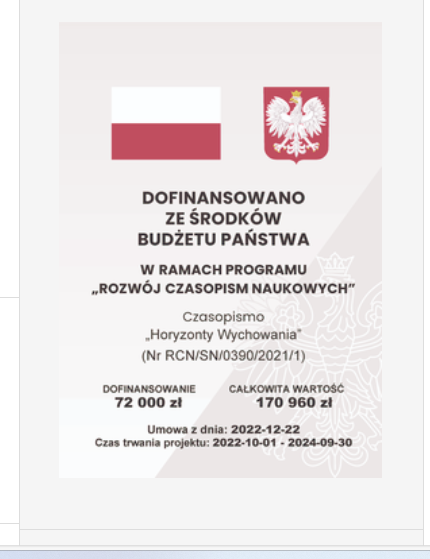 Czasopismo Horyzonty Wychowania uczestniczyło w programie ministerialnym "Rozwój Czasopism Naukowych", którego celem jest wsparcie polskich czasopism naukowych w podejmowanych przez redakcje działaniach zmierzających do podniesienia poziomu praktyk wydawniczych i edytorskich, zwiększenia wpływu czasopism na rozwój nauki oraz utrzymania się czasopism w międzynarodowym obiegu naukowym.